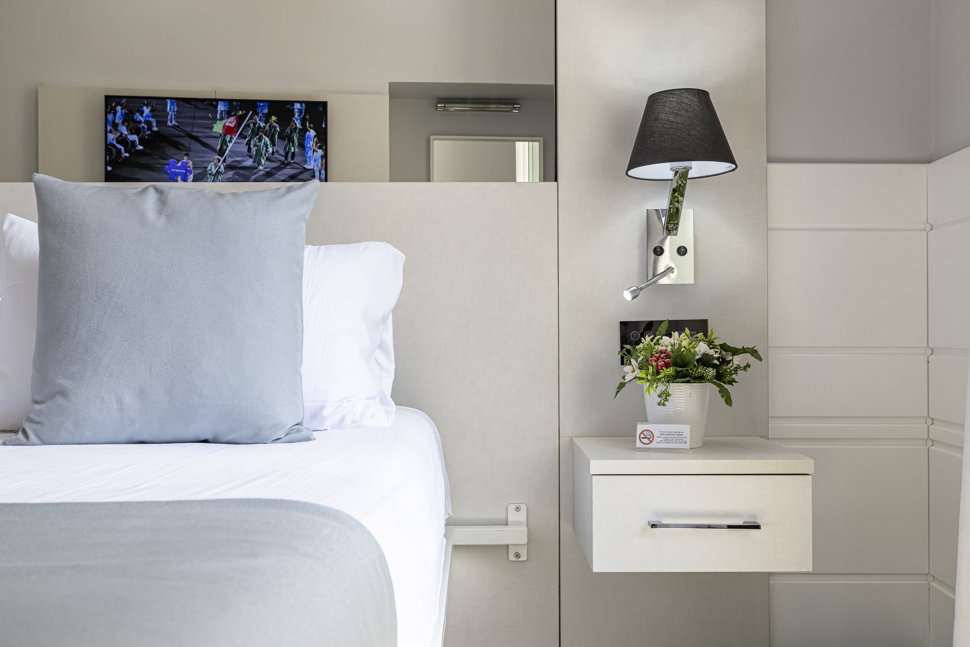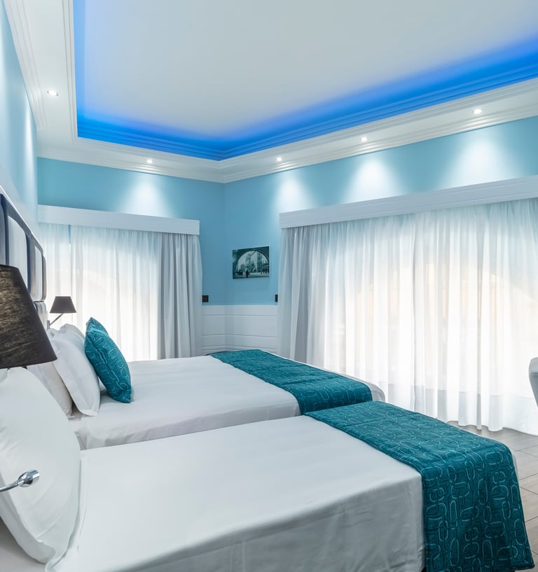 Executive double room with two large arched windows, offering stunning city views from two sides. Elegant and intimate stay, combining contemporary design with superior comfort.